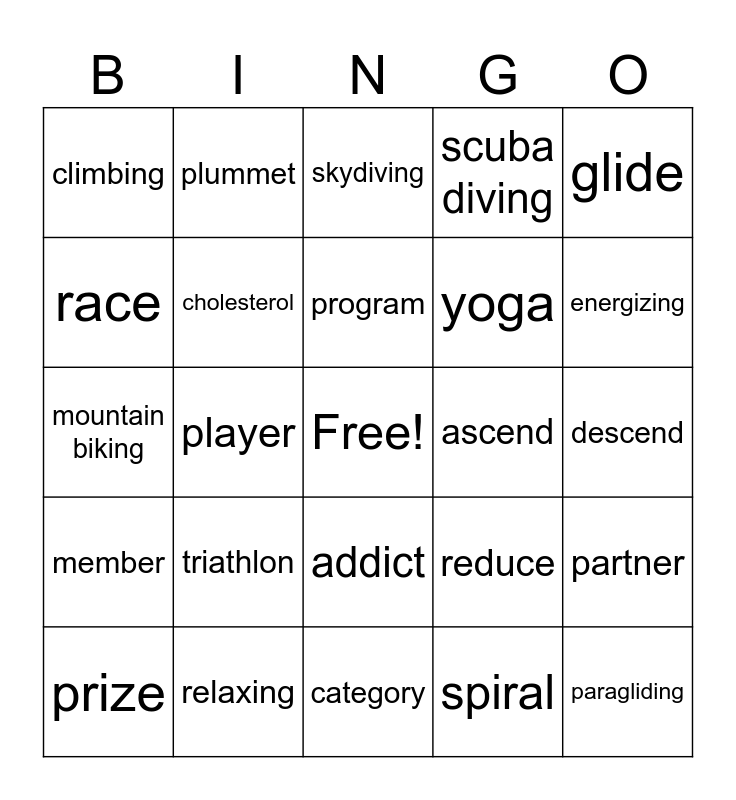 This bingo card has a free space and 24 words: triathlon, relaxing, program, prize, glide, climbing, race, plummet, ascend, addict, yoga, mountain biking, reduce, partner, cholesterol, spiral, descend, skydiving, energizing, player, paragliding, member, scuba diving and category.