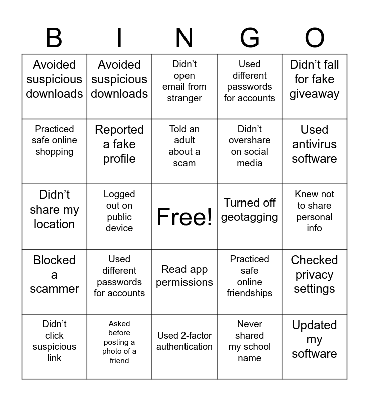 This bingo card has a free space and 29 words: Didn’t click suspicious link, Used a strong password, Logged out on public device, Checked privacy settings, Avoided suspicious downloads, Didn’t open email from stranger, Reported a fake profile, Used different passwords for accounts, Turned off geotagging, Asked before posting a photo of a friend, Knew not to share personal info, Updated my software, Used 2-factor authentication, Never shared my school name, Used antivirus software, Told an adult about a scam, Read app permissions, Blocked a scammer, Didn’t fall for fake giveaway, Didn’t share my location, Practiced safe online friendships, Knew not to share SIN, Didn’t overshare on social media, Practiced safe online shopping, Used different passwords for accounts, Avoided suspicious downloads, Checked privacy settings, Told an adult about a scam and Reported a fake profile.