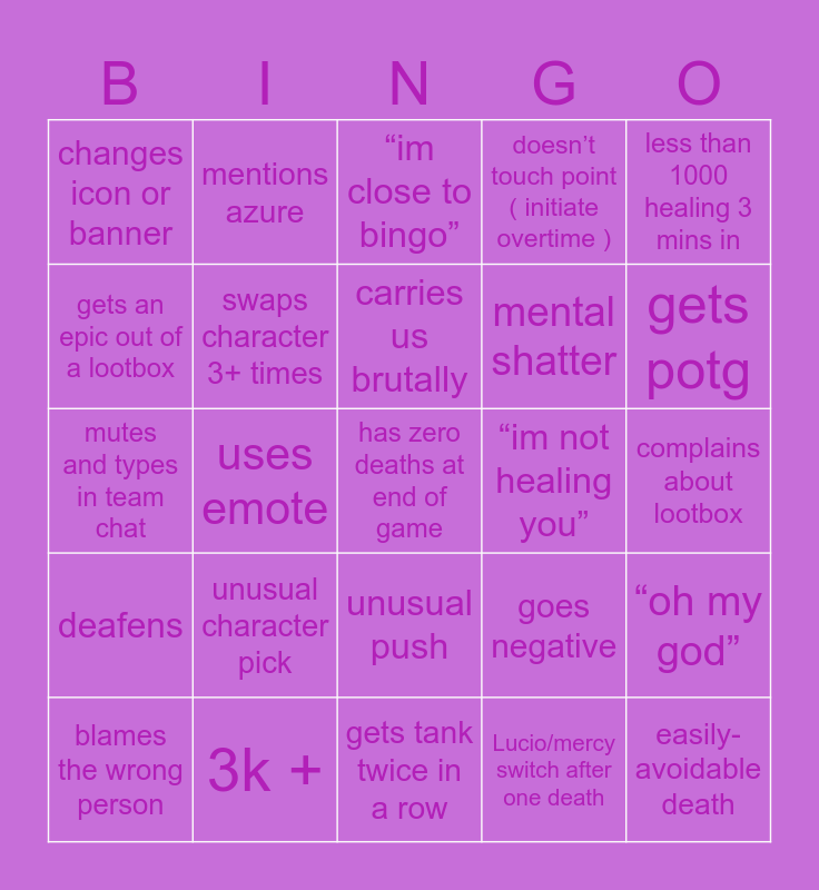 This bingo card has 25 words: unusual character pick, gets tank twice in a row, carries us brutally, blames the wrong person, less than 1000 healing 3 mins in, changes icon or banner, gets an epic out of a lootbox, mentions azure, “im not healing you”, unusual push, mental shatter, mutes and types in team chat, goes negative, “oh my god”, swaps character 3+ times, easily-avoidable death, complains about lootbox, “im close to bingo”, gets potg, uses emote, has zero deaths at end of game, 3k +, deafens, doesn’t touch point ( initiate overtime ) and Lucio/mercy switch after one death.