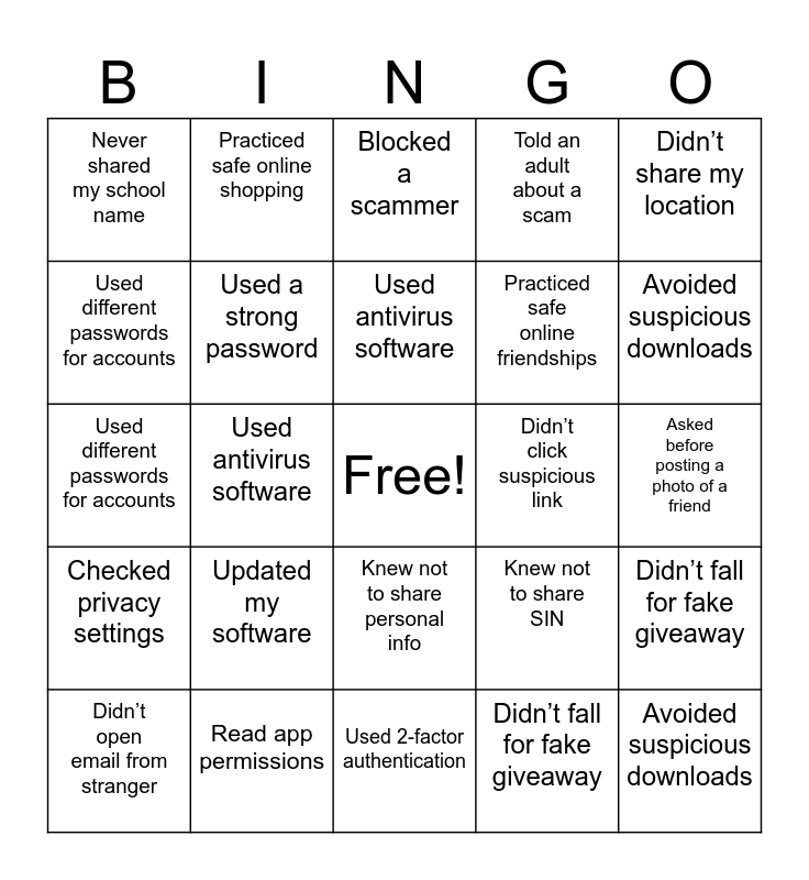 This bingo card has a free space and 29 words: Didn’t open email from stranger, Reported a fake profile, Used antivirus software, Told an adult about a scam, Never shared my school name, Blocked a scammer, Used a strong password, Updated my software, Didn’t click suspicious link, Read app permissions, Asked before posting a photo of a friend, Avoided suspicious downloads, Used 2-factor authentication, Didn’t fall for fake giveaway, Avoided suspicious downloads, Logged out on public device, Knew not to share personal info, Checked privacy settings, Didn’t share my location, Used different passwords for accounts, Knew not to share SIN, Turned off geotagging, Practiced safe online friendships, Used different passwords for accounts, Told an adult about a scam, Practiced safe online shopping, Didn’t fall for fake giveaway, Used antivirus software and Blocked a scammer.