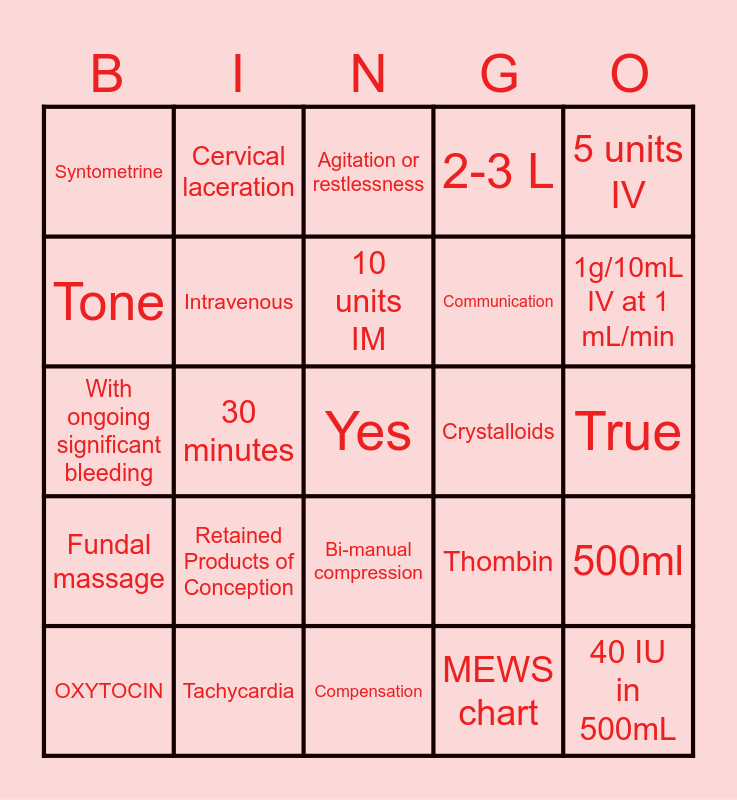 This bingo card has a free space and 29 words: OXYTOCIN, Syntocinon augmentation during labour, 30 minutes, Group & hold, FBC, Coagulation, Syntometrine, Agitation or restlessness, Intravenous, Retained Products of Conception, Crystalloids, Tachycardia, True, 40 IU in 500mL, Compensation, MEWS chart, 1g/10mL IV at 1 mL/min, False, Bi-manual compression, Fundal massage, 5 units IV, With ongoing significant bleeding, Thombin, To expel clots & encourage uterine tone, Communication, Tone, 2-3 L, Cervical laceration, 500ml, 10 units IM and Rapid fluid administration.