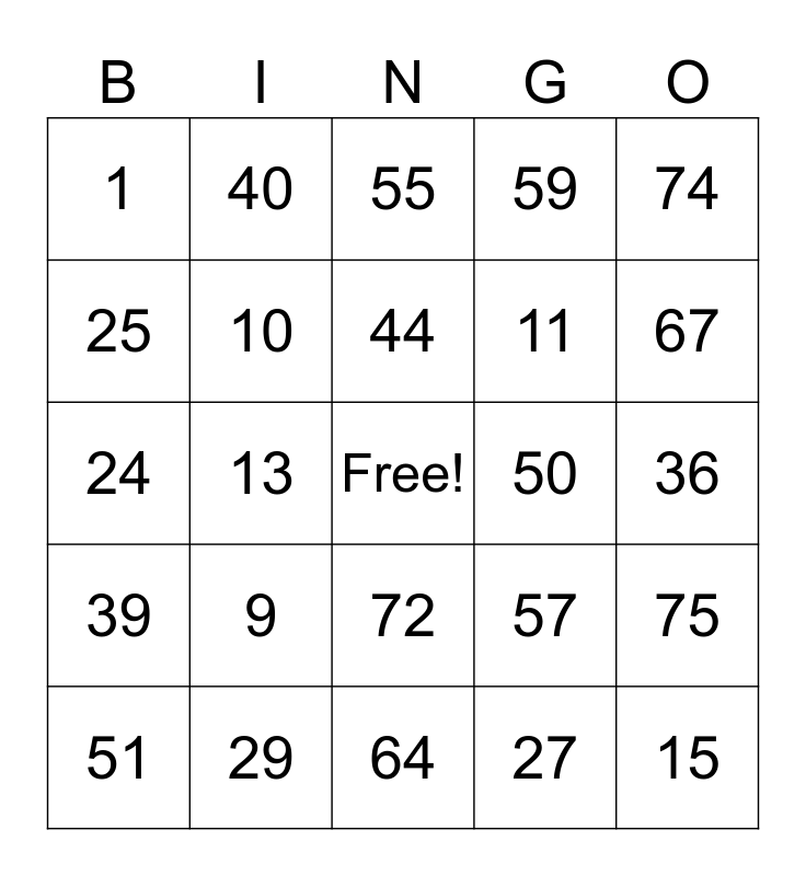 This bingo card has a free space and 24 words: 9, 29, 44, 51, 74, 1, 25, 40, 50, 72, 11, 24, 57, 75, 10, 27, 36, 55, 67, 13, 15, 39, 59 and 64.