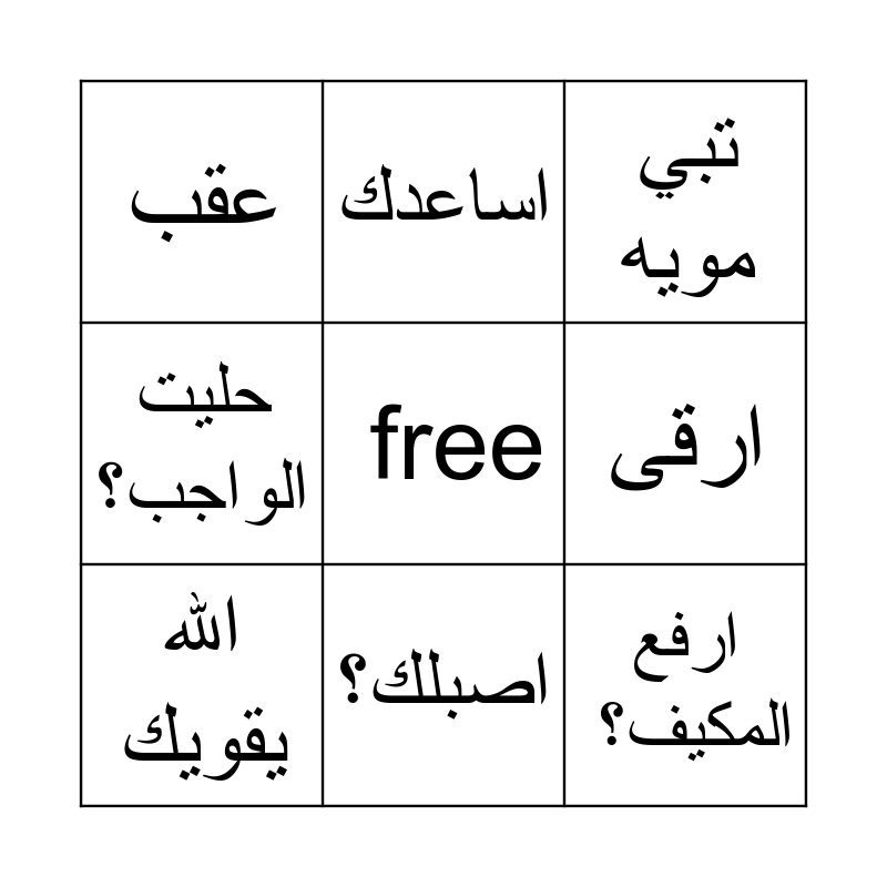 This bingo card has a free space and 8 words: ارقى, تبي مويه, اساعدك, الله يقويك, عقب, ارفع المكيف؟, حليت الواجب؟ and اصبلك؟.