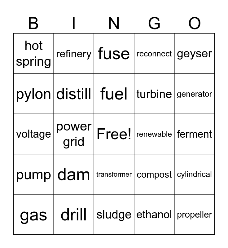 This bingo card has a free space and 24 words: dam, drill, fuel, gas, geyser, hot spring, pylon, refinery, renewable, transformer, turbine, voltage, compost, cylindrical, distill, ethanol, ferment, fuse, generator, power grid, propeller, pump, reconnect and sludge.