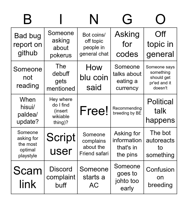 This bingo card has a free space and 24 words: Script user, Discord complaint buff, How blu coin said, Scam link, Off topic in general, Bad bug report on github, Someone not reading, Someone asking about pokerus, Recommending breeding by BE, Someone complains about the Friend safari, Someone talks about eating a currency, When hisui/ paldea/ update?, Asking for information that's in the pins, The bot autoreacts to something, The debuff gets mentioned, Someone goes to johto too early, Political talk happens, Bot coins/ off topic people in general chat, Someone says something should get pr'ed and it doesn't, Hey where do I find (insert wikiable thing)?, Confusion on breeding, Someone asking for the most optimal playstyle, Asking for codes and Someone starts a AC.