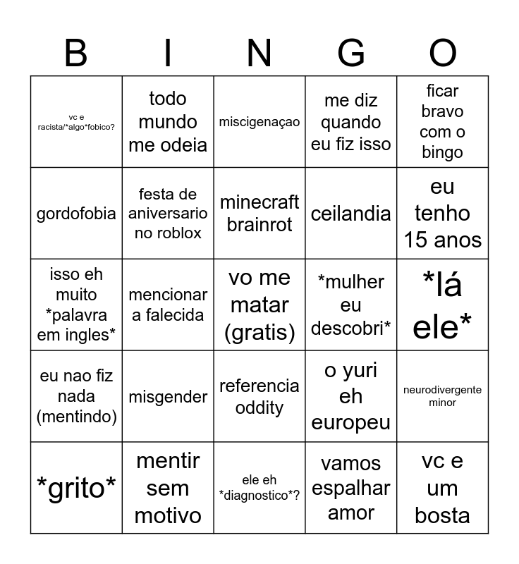 This bingo card has a free space and 28 words: neurodivergente minor, *barra de metal*, ceilandia, vamos espalhar amor, gordofobia, miscigenaçao, todo mundo me odeia, eu nao fiz nada (mentindo), *mulher eu descobri*, *grito*, isso eh muito *palavra em ingles*, me diz quando eu fiz isso, mentir sem motivo, ele eh *diagnostico*?, eu tenho 15 anos, bolsa familia, misgender, festa de aniversario no roblox, minecraft brainrot, referencia oddity, vc e racista/*algo*fobico?, nao nao nao, vc e um bosta, mencionar a falecida, *lá ele*, o yuri eh europeu, ficar bravo com o bingo and a transgenera.