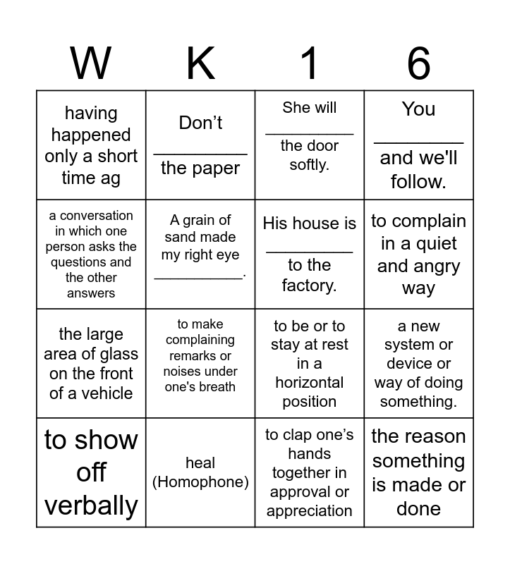 This bingo card has 16 words: heal (Homophone), a new system or device or way of doing something., She will __________ the door softly., having happened only a short time ag, the large area of glass on the front of a vehicle, Don’t _________ the paper, to be or to stay at rest in a horizontal position, to clap one’s hands together in approval or appreciation, a conversation in which one person asks the questions and the other answers, A grain of sand made my right eye ___________., to show off verbally, You ________ and we'll follow., to make complaining remarks or noises under one's breath, to complain in a quiet and angry way, His house is _________ to the factory. and the reason something is made or done.