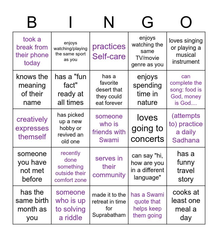 This bingo card has a free space and 24 words: has the same birth month as you, recently done something outside their comfort zone, has a favorite desert that they could eat forever, has a Swami quote that helps keep them going, loves singing or playing a musical instrument, took a break from their phone today, enjoys watching/playing the same sport as you, practices Self-care, loves going to concerts, (attempts to) practice a daily Sadhana, creatively expresses themself, has a "fun fact" ready at all times, can say "hi, how are you in a different language", has a funny travel story, knows the meaning of their name, someone who is up to solving a riddle, made it to the retreat in time for Suprabatham, enjoys watching the same TV/movie genre as you, can complete the song: food is God, money is God...., someone you have not met before, has picked up a new hobby or revived an old one, serves in their community, enjoys spending time in nature and cooks at least one meal a day.