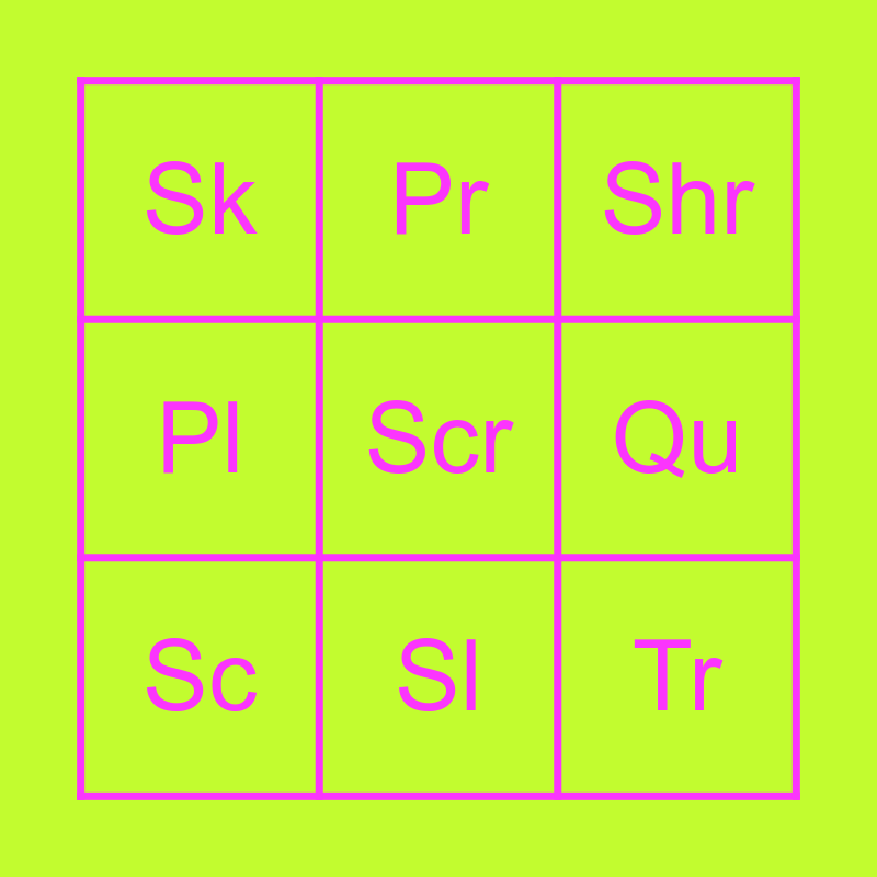This bingo card has a free space and 8 words: Pl, Pr, Qu, Sc, Shr, Sk, Sl and Tr.
