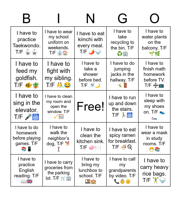 This bingo card has a free space and 33 words: I have to take out trash to the trash room. T/F ๐ฎ๐ข, I have to press the elevator button and wait. T/F ๐โณ, I have to clean my room and open the window. T/F ๐งน๐ช, I have to wash my hands before eating. T/F ๐๐ฝ๏ธ, I have to do homework before playing games. T/F ๐๐ฑ, I have to fight with my sibling. T/F ๐คผโโ๏ธ๐, I have to water plants on the balcony. T/F ๐ฑ๐ฟ, I have to practice English reading. T/F ๐๐ฌ๐ง, I have to wear my school uniform on weekends. T/F ๐๐ , I have to help set the table. T/F ๐ฝ๏ธ๐โโ๏ธ, I have to take a shower before bed. T/F ๐ฟ๐, I have to eat kimchi with every meal. T/F ๐ถ๏ธ๐, I have to read a webtoon before sleeping. T/F ๐ฑ๐ด, I have to clean the bathroom with my parents. T/F ๐๐งฝ, I have to run up and down the stairs. T/F ๐โโ๏ธ๐, I have to finish math homework before TV. T/F โ๐บ, I have to carry groceries from the parking lot. T/F ๐๐ข, I have to sing in the elevator. T/F ๐ค๐, I have to walk the neighborโs dog. T/F ๐๐ถโโ๏ธ, I have to eat spicy ramen for breakfast. T/F ๐๐ณ, I have to clean the kitchen sink. T/F ๐งผ๐ฝ๏ธ, I have to write a diary. T/F ๐๐๏ธ, I have to practice Taekwondo. T/F ๐ฅ๐ฅ, I have to sleep with my shoes on. T/F ๐๐๏ธ, I have to bring my lunchbox to school. T/F ๐ฑ๐ซ, I have to carry heavy rice bags. T/F ๐๏ธโโ๏ธ๐, I have to take recycling to the bin. T/F โป๏ธ๐ข, I have to do jumping jacks in the hallway. T/F ๐คธโโ๏ธ๐ช, I have to feed my goldfish. T/F ๐ ๐ชด, I have to wear a mask in study rooms. T/F ๐ท๐, I have to clean my desk before leaving. T/F ๐งน๐ฅ๏ธ, I have to call my grandparents by video. T/F ๐๐ต๐ด and I have to drink milk with meals. T/F ๐ฅ๐ด.