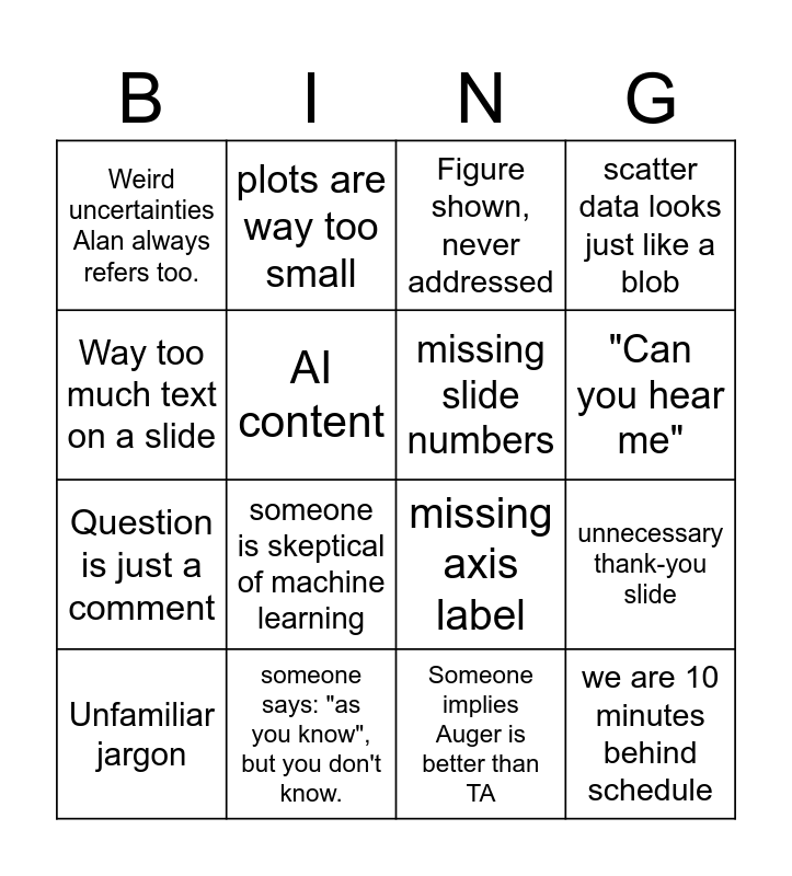 This bingo card has 17 words: Someone implies Auger is better than TA, Unfamiliar jargon, Figure shown, never addressed, Weird uncertainties Alan always refers too., someone is skeptical of machine learning, scatter data looks just like a blob, unnecessary thank-you slide, missing slide numbers, "Can you hear me", AI content, someone says: "as you know", but you don't know., missing axis label, Way too much text on a slide, plots are way too small, Question is just a comment, Long discussion and we are 10 minutes behind schedule.