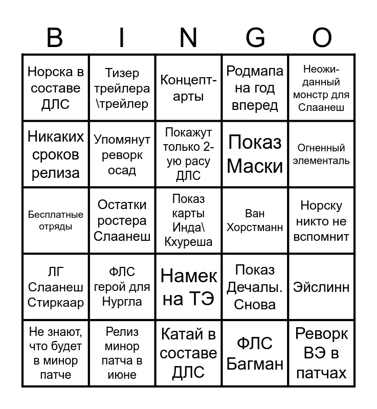 This bingo card has 25 words: ФЛС герой для Нургла, Катай в составе ДЛС, Покажут только 2-ую расу ДЛС, Не знают, что будет в минор патче, Неожи-данный монстр для Слаанеш, Норска в составе ДЛС, Никаких сроков релиза, Тизер трейлера \трейлер, Ван Хорстманн, Намек на ТЭ, Показ Маски, Бесплатные отряды, Показ Дечалы. Снова, Эйслинн, Упомянут реворк осад, Реворк ВЭ в патчах, Норску никто не вспомнит, Концепт-арты, Огненный элементаль, Остатки ростера Слаанеш, Показ карты Инда\ Кхуреша, Релиз минор патча в июне, ЛГ Слаанеш Стиркаар, Родмапа на год вперед and ФЛС Багман.
