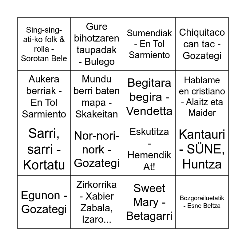 This bingo card has 20 words: Kantauri - SÜNE, Huntza, Kantu bat - Bulego, Sumendiak - En Tol Sarmiento, Deskontrola - Zetak, Egunon - Gozategi, Aukera berriak - En Tol Sarmiento, Zirkorrika - Xabier Zabala, Izaro..., Sing-sing-ati-ko folk & rolla - Sorotan Bele, Sarri, sarri - Kortatu, Gure bihotzaren taupadak - Bulego, Nor-nori-nork - Gozategi, Eskutitza - Hemendik At!, Mundu berri baten mapa - Skakeitan, Bozgorailuetatik - Esne Beltza, Begitara begira - Vendetta, Furra furra - Oskorri, Hablame en cristiano - Alaitz eta Maider, Chiquitaco can tac - Gozategi, Sweet Mary - Betagarri and Katedral bat - Berri Txarrak.