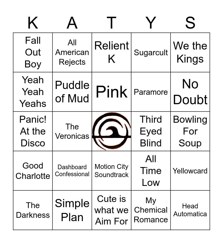 This bingo card has a free space and 34 words: Blink 182, My Chemical Romance, Jimmy Eat World, Green Day, Good Charlotte, Puddle of Mud, We the Kings, The Darkness, All American Rejects, Boys Like Girls, Pink, Relient K, 3 Doors Down, Plain White T's, Third Eyed Blind, No Doubt, Simple Plan, Panic! At the Disco, Dashboard Confessional, All Time Low, Motion City Soundtrack, Story of the Year, Fall Out Boy, Bowling For Soup, Cute is what we Aim For, Head Automatica, Sugarcult, Jack's Mannequin, Paramore, Yeah Yeah Yeahs, The XX, The Veronicas, Yellowcard and Taking Back Sunday.