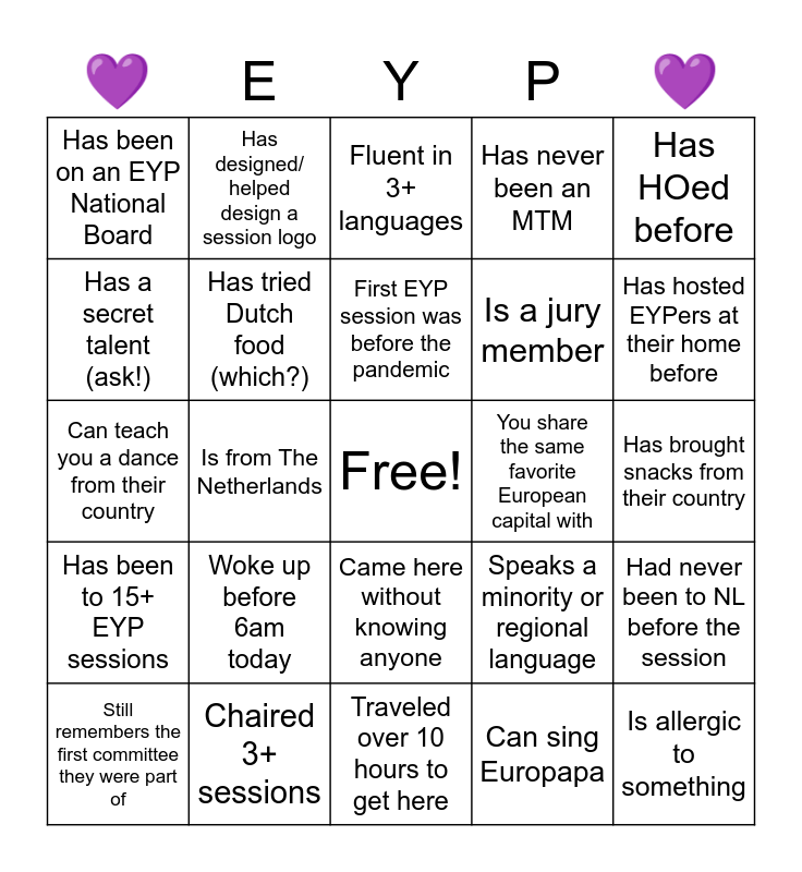 This bingo card has a free space and 24 words: Woke up before 6am today, Chaired 3+ sessions, First EYP session was before the pandemic, Still remembers the first committee they were part of, Has HOed before, Has been on an EYP National Board, Has a secret talent (ask!), Has designed/ helped design a session logo, You share the same favorite European capital with, Came here without knowing anyone, Is a jury member, Can teach you a dance from their country, Speaks a minority or regional language, Had never been to NL before the session, Has tried Dutch food (which?), Can sing Europapa, Has brought snacks from their country, Fluent in 3+ languages, Has hosted EYPers at their home before, Is from The Netherlands, Is allergic to something, Has been to 15+ EYP sessions, Has never been an MTM and Traveled over 10 hours to get here.