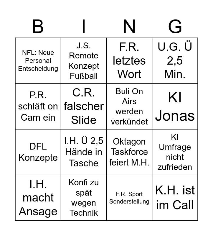 This bingo card has 16 words: I.H. macht Ansage, Konfi zu spät wegen Technik, F.R. letztes Wort, U.G. Ü 2,5 Min., P.R. schläft on Cam ein, J.S. Remote Konzept Fußball, Oktagon Taskforce feiert M.H., KI Umfrage nicht zufrieden, NFL: Neue Personal Entscheidung, C.R. falscher Slide, F.R. Sport Sonderstellung, KI Jonas, DFL Konzepte, I.H. Ü 2,5 Hände in Tasche, Buli On Airs werden verkündet and K.H. ist im Call.