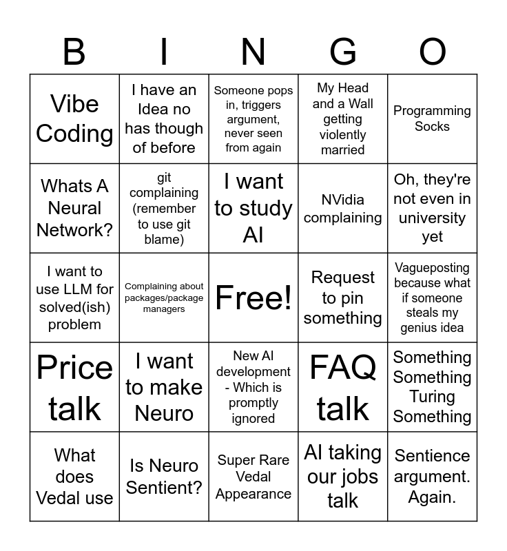 This bingo card has a free space and 24 words: I want to make Neuro, Is Neuro Sentient?, I want to study AI, What does Vedal use, Programming Socks, Vibe Coding, Whats A Neural Network?, I have an Idea no has though of before, Request to pin something, New AI development - Which is promptly ignored, NVidia complaining, I want to use LLM for solved(ish) problem, FAQ talk, Something Something Turing Something, git complaining (remember to use git blame), AI taking our jobs talk, Vagueposting because what if someone steals my genius idea, Someone pops in, triggers argument, never seen from again, Oh, they're not even in university yet, Complaining about packages/package managers, Sentience argument. Again., Price talk, My Head and a Wall getting violently married and Super Rare Vedal Appearance.