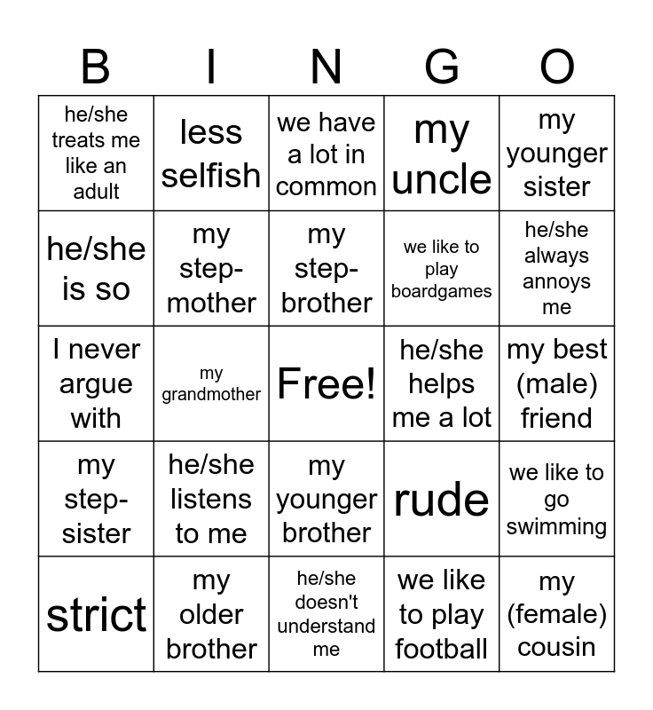 This bingo card has a free space and 40 words: I get on well with, I never argue with, my step-father, my step-mother, my older brother, my younger brother, my step-brother, my older sister, my younger sister, my step-sister, my grandmother, my uncle, my (female) cousin, my best (male) friend, he/she helps me a lot, he/she listens to me, he/she understands me, he/she treats me like an adult, we have the same interests, we have a lot in common, we like to go swimming, we like to play football, we like to play boardgames, he/she is so, happy, kind, affectionate, polite, I don't get on well with, I argue a lot with, I fight a lot with, strict, sad, rude, he/she always annoys me, he/she doesn't understand me, if only he/she were, more honest, less selfish and less annoying.