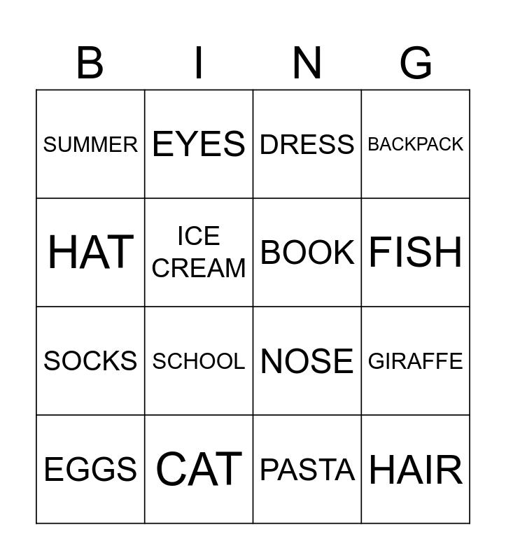 This bingo card has 16 words: CAT, GIRAFFE, DRESS, SUMMER, SOCKS, EYES, NOSE, PASTA, HAT, ICE CREAM, EGGS, BACKPACK, SCHOOL, FISH, BOOK and HAIR.