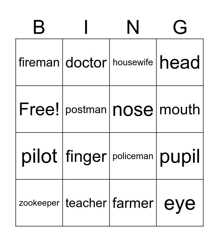 This bingo card has 16 words: teacher, pupil, housewife, fireman, pilot, doctor, policeman, farmer, Free!, postman, zookeeper, head, finger, mouth, nose and eye.