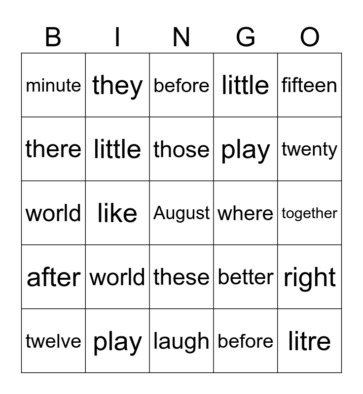 This bingo card has a free space and 89 words: better, they, these, were, should, where, found, around, thank, some, going, again, right, together, right, those, when, know, come, myself, away, why, laugh, always, world, play, pretty, please, language, litre, little, like, July, minute, volume, before, there, fourteen, twenty, twelve, after, fifteen, thousand, million, better, where, going, right, myself, they, found, again, those, away, these, around, August, when, why, were, thank, right, know, laugh, should, some, together, come, always, world, litre, volume, twelve, play, little, before, after, pretty, like, there, fifteen, please, July, fourteen, thousand, language, minute, twenty and million.