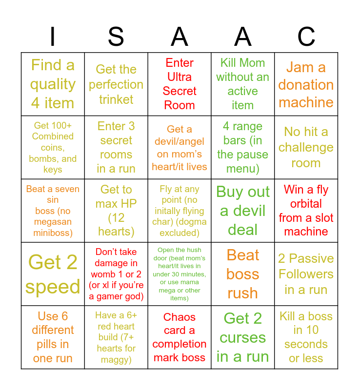 This bingo card has 63 words: get to an error room, sacrifice to dark room, Get horns (characters cannot start with them; IE: eve, azaze), 2 Passive Followers in a run, Get 3 orbitals in a run, Get 6 Permanent Damage (no azzy), Get the perfection trinket, Beat Mom’s heart/it lives w/o shopping, Get a devil/angel on mom’s heart/it lives, Pay out a Devil, Key, and Coin beggar in one run, Open the hush door (beat mom’s heart/it lives in under 30 minutes, or use mama mega or other items), Beat Mom’s heart without ever gaining red heart containers, Win a fly orbital from a slot machine, Jam a donation machine, Kill a gurdy boss, Get 100+ Combined coins, bombs, and keys, Get to max HP (12 hearts), Find a quality 4 item, Get a book active item, 4 range bars (in the pause menu), Don’t take damage in womb 1 or 2 (or xl if you’re a gamer god), Get 2 speed, Kill Mom without an active item, Kill mom while skipping 2 treasure rooms, Die to any self-damaging item (no bombs, but active items like mr boom count), Get skatole (pay out a shell game), Completely explore a womb floor (secrets included), Fart on mom’s heart, Get any transformation, Collect a syringe item, Kill a split-green champion enemy, Beat a floor boss with half a heart left, Kill a boss with only bombs, Clear a boss challenge room, No hit a challenge room, Use 6 different pills in one run, Use the joker card, Get 2 curses in a run, Get a gold key, Enter 3 secret rooms in a run, Beat a seven sin boss (no megasan miniboss), Buy out a devil deal, Get 2 angel rooms in one run, Beat mom’s heart without a trinket, Fly at any point (no initally flying char) (dogma excluded), Have a 6+ red heart build (7+ hearts for maggy), Kill a boss in 10 seconds or less, Beat boss rush, Buy out a shop, Get an item with “head” in its name, Take no hit during horsemen fights (Beast), Chaos card a completion mark boss, Find a crawlspace, Enter the end chest or beast, Open the closet (home level), Enter Ultra Secret Room, Get a planetarium Item, Get a technology item, Get Bob's brain, Get an angel item from sacrifice room, Meet Krampus, Get 5 tear rate and Luck 4 (no perfection trinket).