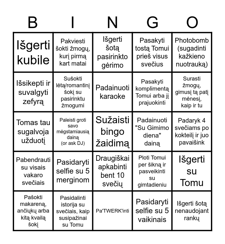 This bingo card has a free space and 24 words: Pasidaryti selfie su 5 merginom, Pasidalinti istorija su svečiais, kaip susipažinai su Tomu, Padainuoti karaoke, Pašokti makareną, ančiųkų arba kitą kvailą šokį, Photobomb (sugadinti kažkieno nuotrauką), Išgerti kubile, Išsikepti ir suvalgyti zefyrą, Pakviesti šokti žmogų, kurį pirmą kart matai, Padainuoti "Su Gimimo diena" dainą, Draugiškai apkabinti bent 10 svečių, Pasakyti komplimentą Tomui arba jį prajuokinti, Tomas tau sugalvoja užduotį, Ploti Tomui per šikną ir pasveikinti su gimtadieniu, Išgerti su Tomu, Sušokti lėtą/romantinį šokį su pasirinktu žmogumi, Pasidaryti selfie su 5 vaikinais, Padaryk 4 svečiams po kokteilį ir juo pavaišink, Išgerti šotą pasirinkto gėrimo, Surasti žmogų, gimusį tą patį mėnesį, kaip ir tu, Paleisti groti savo mėgstamiausią dainą (or ask DJ), Išgerti šotą nenaudojant rankų, Pabendrauti su visais vakaro svečiais, Pasakyti tostą Tomui prieš visus svečius and Pa'TWERK'inti.