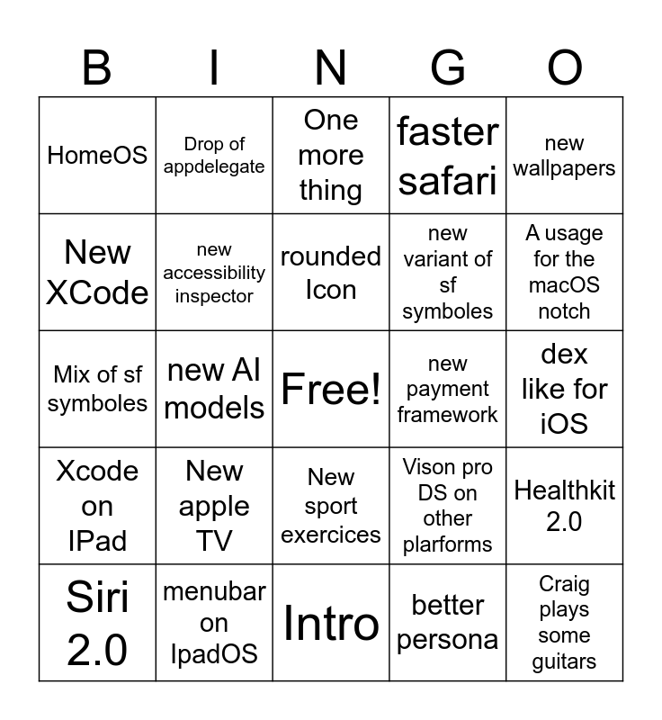 This bingo card has a free space and 24 words: New apple TV, menubar on IpadOS, rounded Icon, Siri 2.0, new wallpapers, HomeOS, New XCode, Drop of appdelegate, new payment framework, New sport exercices, new variant of sf symboles, Mix of sf symboles, Vison pro DS on other plarforms, Healthkit 2.0, new accessibility inspector, better persona, dex like for iOS, One more thing, A usage for the macOS notch, new AI models, Craig plays some guitars, Xcode on IPad, faster safari and Intro.