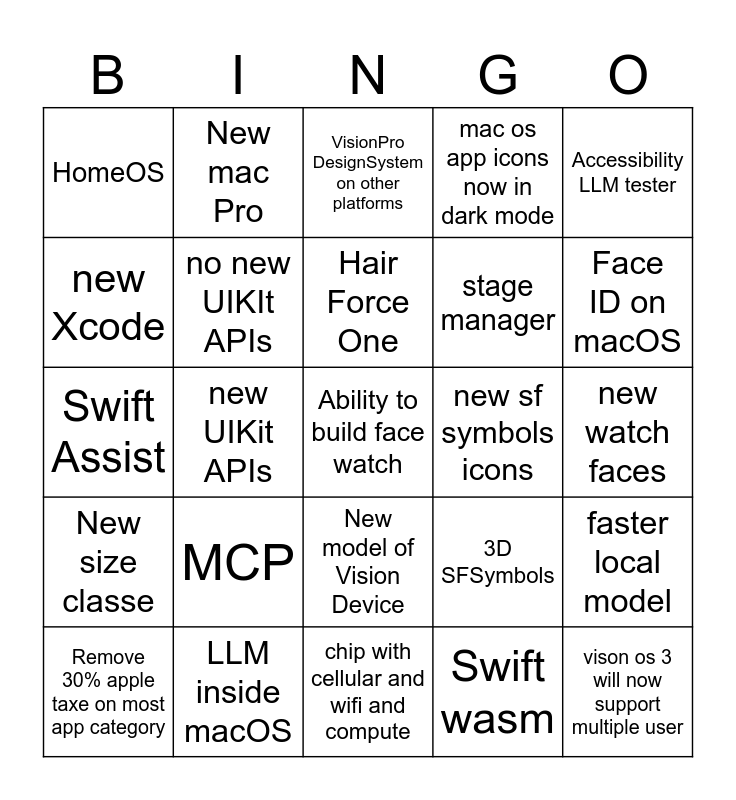 This bingo card has a free space and 24 words: MCP, LLM inside macOS, Hair Force One, Remove 30% apple taxe on most app category, Accessibility LLM tester, HomeOS, new Xcode, New mac Pro, new sf symbols icons, New model of Vision Device, stage manager, Swift Assist, 3D SFSymbols, faster local model, no new UIKIt APIs, Swift wasm, new watch faces, VisionPro DesignSystem on other platforms, Face ID on macOS, new UIKit APIs, vison os 3 will now support multiple user, New size classe, mac os app icons now in dark mode and chip with cellular and wifi and compute.