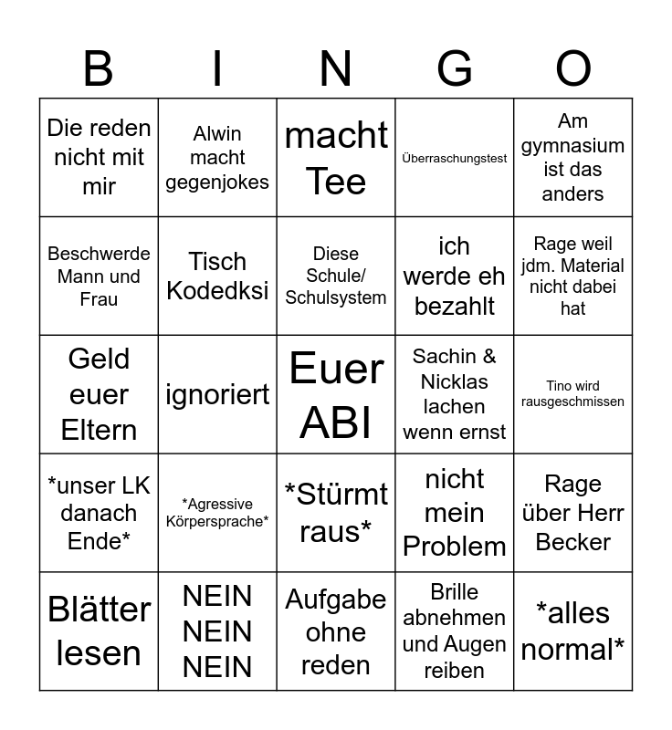 This bingo card has a free space and 24 words: *Agressive Körpersprache*, NEIN NEIN NEIN, Diese Schule/ Schulsystem, Blätter lesen, Am gymnasium ist das anders, Die reden nicht mit mir, Beschwerde Mann und Frau, Alwin macht gegenjokes, Sachin & Nicklas lachen wenn ernst, *Stürmt raus*, ich werde eh bezahlt, Geld euer Eltern, nicht mein Problem, Rage über Herr Becker, Tisch Kodedksi, Brille abnehmen und Augen reiben, Tino wird rausgeschmissen, macht Tee, Rage weil jdm. Material nicht dabei hat, ignoriert, *alles normal*, *unser LK danach Ende*, Überraschungstest and Aufgabe ohne reden.