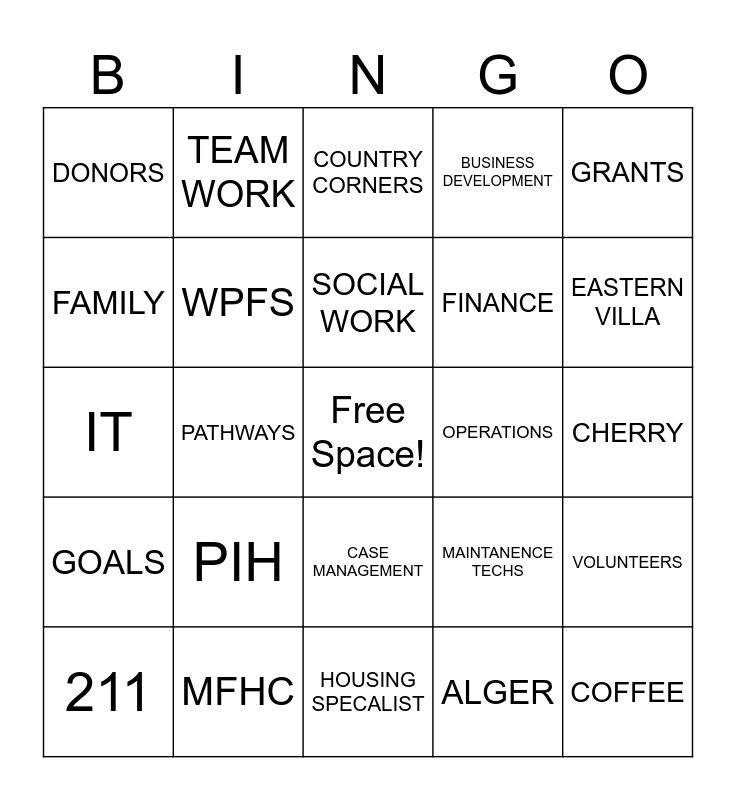 This bingo card has a free space and 24 words: PIH, MFHC, SOCIAL WORK, 211, GRANTS, DONORS, FAMILY, TEAM WORK, OPERATIONS, CASE MANAGEMENT, FINANCE, IT, MAINTANENCE TECHS, VOLUNTEERS, WPFS, ALGER, CHERRY, COUNTRY CORNERS, EASTERN VILLA, PATHWAYS, COFFEE, GOALS, BUSINESS DEVELOPMENT and HOUSING SPECALIST.