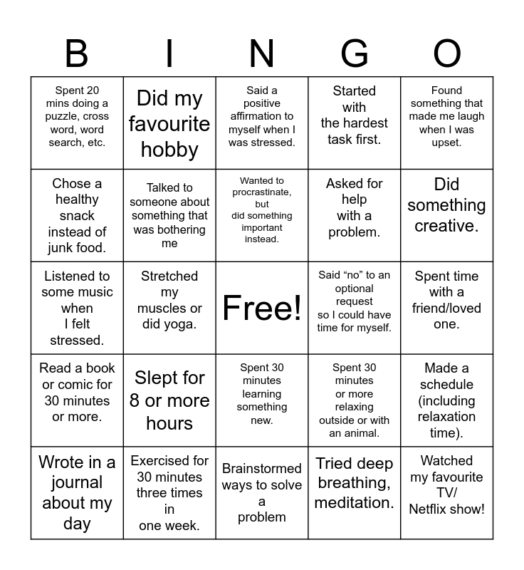 This bingo card has a free space and 24 words: Slept for 8 or more hours, Exercised for 30 minutes three times in one week., Wanted to procrastinate, but did something important instead., Wrote in a journal about my day, Found something that made me laugh when I was upset., Spent 20 mins doing a puzzle, cross word, word search, etc., Chose a healthy snack instead of junk food., Did my favourite hobby, Said “no” to an optional request so I could have time for myself., Spent 30 minutes learning something new., Asked for help with a problem., Listened to some music when I felt stressed., Spent 30 minutes or more relaxing outside or with an animal., Made a schedule (including relaxation time)., Talked to someone about something that was bothering me, Tried deep breathing, meditation., Spent time with a friend/loved one., Said a positive affirmation to myself when I was stressed., Did something creative., Stretched my muscles or did yoga., Watched my favourite TV/ Netflix show!, Read a book or comic for 30 minutes or more., Started with the hardest task first. and Brainstormed ways to solve a problem.