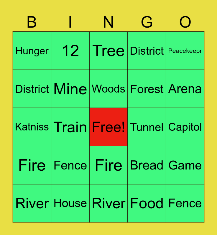 This bingo card has a free space and 24 words: Fence, House, Woods, River, Peacekeepr, Hunger, District, 12, Tunnel, Fire, Forest, Katniss, Bread, Game, Mine, Food, Capitol, Tree, Arena, Train, Fence, Fire, District and River.