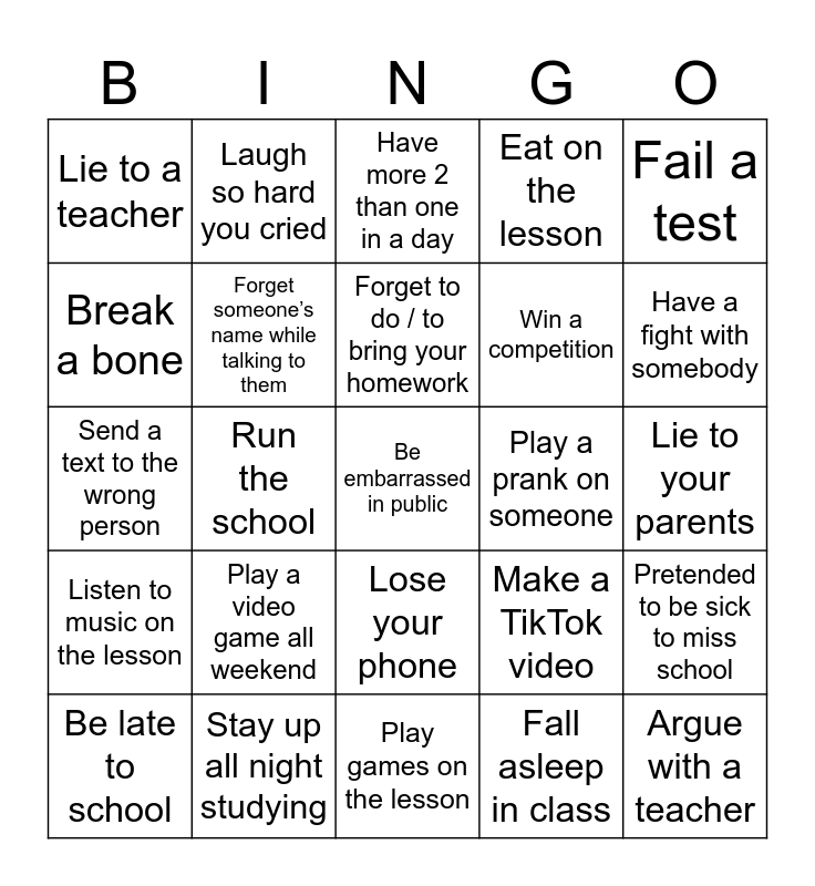 This bingo card has a free space and 24 words: Play a video game all weekend, Stay up all night studying, Forget to do / to bring your homework, Be late to school, Fail a test, Lie to a teacher, Break a bone, Laugh so hard you cried, Play a prank on someone, Lose your phone, Win a competition, Send a text to the wrong person, Make a TikTok video, Pretended to be sick to miss school, Forget someone’s name while talking to them, Fall asleep in class, Lie to your parents, Have more 2 than one in a day, Have a fight with somebody, Run the school, Argue with a teacher, Listen to music on the lesson, Eat on the lesson and Play games on the lesson.