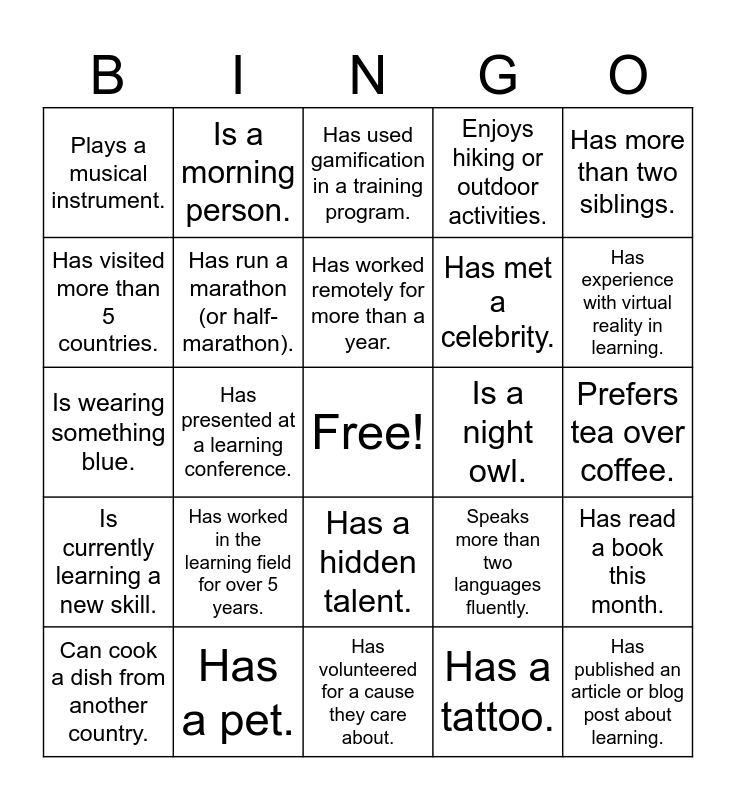 This bingo card has a free space and 24 words: Has worked in the learning field for over 5 years., Has a pet., Has worked remotely for more than a year., Can cook a dish from another country., Has more than two siblings., Plays a musical instrument., Has visited more than 5 countries., Is a morning person., Is a night owl., Has a hidden talent., Has met a celebrity., Is wearing something blue., Speaks more than two languages fluently., Has read a book this month., Has run a marathon (or half-marathon)., Has a tattoo., Prefers tea over coffee., Has used gamification in a training program., Has experience with virtual reality in learning., Has presented at a learning conference., Has published an article or blog post about learning., Is currently learning a new skill., Enjoys hiking or outdoor activities. and Has volunteered for a cause they care about..