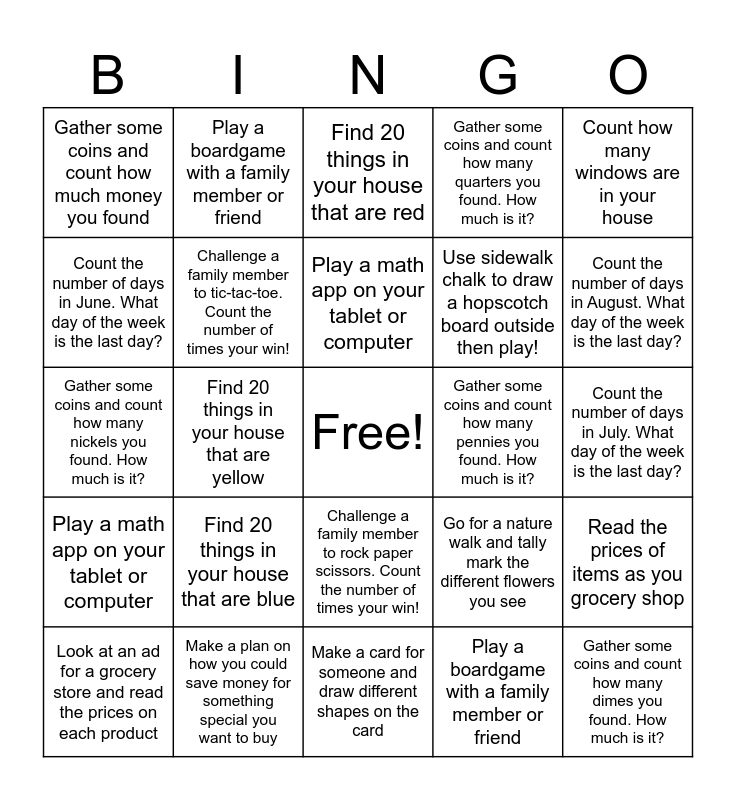 This bingo card has a free space and 24 words: Find 20 things in your house that are blue, Make a plan on how you could save money for something special you want to buy, Play a math app on your tablet or computer, Look at an ad for a grocery store and read the prices on each product, Count how many windows are in your house, Gather some coins and count how much money you found, Count the number of days in June. What day of the week is the last day?, Play a boardgame with a family member or friend, Gather some coins and count how many pennies you found. How much is it?, Challenge a family member to rock paper scissors. Count the number of times your win!, Use sidewalk chalk to draw a hopscotch board outside then play!, Gather some coins and count how many nickels you found. How much is it?, Go for a nature walk and tally mark the different flowers you see, Read the prices of items as you grocery shop, Challenge a family member to tic-tac-toe. Count the number of times your win!, Play a boardgame with a family member or friend, Count the number of days in July. What day of the week is the last day?, Find 20 things in your house that are red, Count the number of days in August. What day of the week is the last day?, Find 20 things in your house that are yellow, Gather some coins and count how many dimes you found. How much is it?, Play a math app on your tablet or computer, Gather some coins and count how many quarters you found. How much is it? and Make a card for someone and draw different shapes on the card.