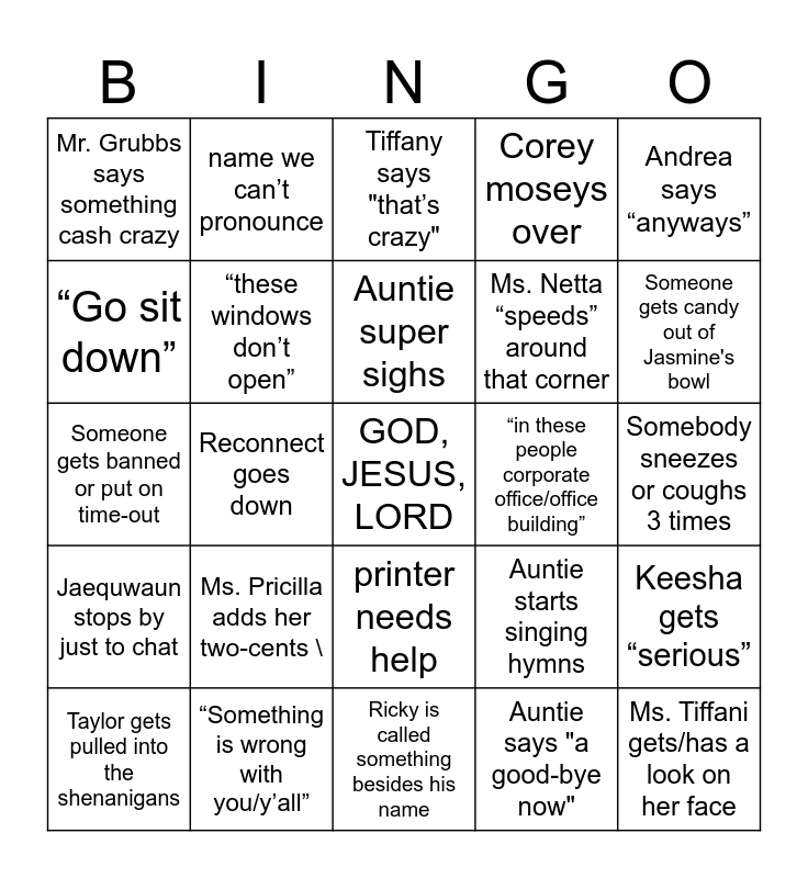This bingo card has a free space and 24 words: Ms. Pricilla adds her two-cents \, “Something is wrong with you/y’all”, Auntie super sighs, Taylor gets pulled into the shenanigans, Andrea says “anyways”, Mr. Grubbs says something cash crazy, “Go sit down”, name we can’t pronounce, “in these people corporate office/office building”, printer needs help, Ms. Netta “speeds” around that corner, Someone gets banned or put on time-out, Auntie starts singing hymns, Keesha gets “serious”, “these windows don’t open”, Auntie says "a good-bye now", Somebody sneezes or coughs 3 times, Tiffany says "that’s crazy", Someone gets candy out of Jasmine's bowl, Reconnect goes down, Ms. Tiffani gets/has a look on her face, Jaequwaun stops by just to chat, Corey moseys over and Ricky is called something besides his name.