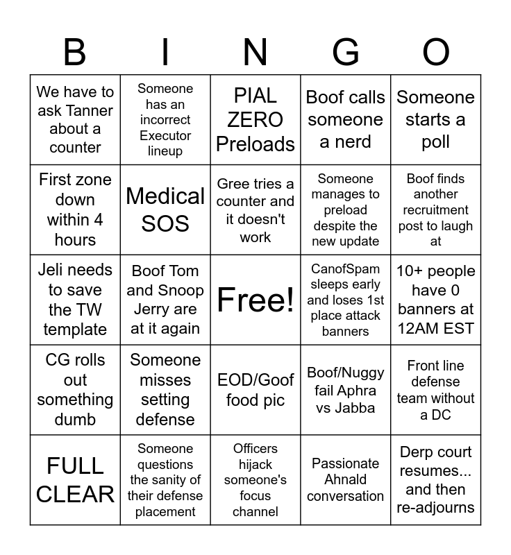 This bingo card has a free space and 28 words: Front line defense team without a DC, 5+ people have 0 banners at 8AM EST, Someone manages to preload despite the new update, Passionate Ahnald conversation, First zone down within 4 hours, PIAL ZERO Preloads, Someone has an incorrect Executor lineup, CG rolls out something dumb, CanofSpam sleeps early and loses 1st place attack banners, FULL CLEAR, Jeli needs to save the TW template, Boof calls someone a nerd, Someone questions the sanity of their defense placement, Officers hijack someone's focus channel, Boof finds another recruitment post to laugh at, < 50% FAE zone (from either side), Someone misses setting defense, Medical SOS, Gree tries a counter and it doesn't work, EOD/Goof food pic, We have to ask Tanner about a counter, Sandbagging Opponent, Derp court resumes... and then re-adjourns, Boof Tom and Snoop Jerry are at it again, 10+ people have 0 banners at 12AM EST, Boof/Nuggy fail Aphra vs Jabba, Someone starts a poll and Boof/Snoop screw up their SEE-GLAT counter.