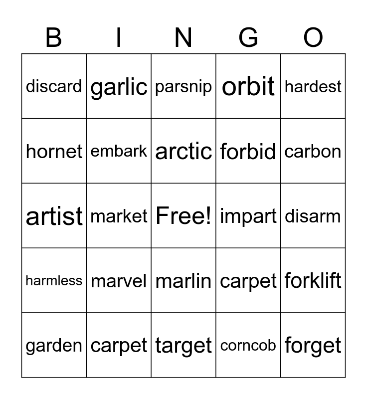 This bingo card has a free space and 33 words: farmland, hardtop, market, armrest, harmless, embark, hardest, garden, garlic, harvest, arctic, parsnip, garment, scarlet, impart, carbon, carpet, artist, marvel, carpet, marlin, harness, discard, disarm, target, forget, orbit, forbid, hornet, forklift, forest, corncob and tarnish.