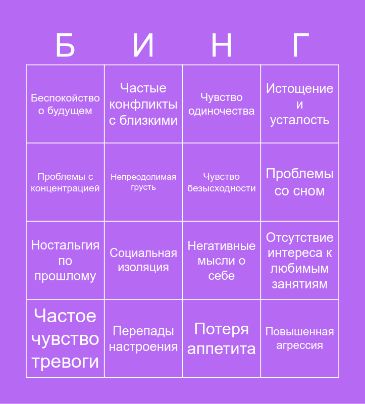 This bingo card has 16 words: Частое чувство тревоги, Перепады настроения, Чувство одиночества, Истощение и усталость, Проблемы с концентрацией, Частые конфликты с близкими, Негативные мысли о себе, Отсутствие интереса к любимым занятиям, Беспокойство о будущем, Непреодолимая грусть, Потеря аппетита, Проблемы со сном, Ностальгия по прошлому, Социальная изоляция, Чувство безысходности and Повышенная агрессия.