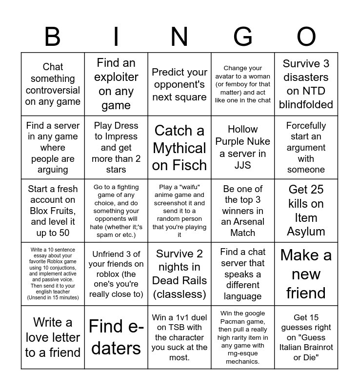 This bingo card has 25 words: Unfriend 3 of your friends on roblox (the one's you're really close to), Win a 1v1 duel on TSB with the character you suck at the most., Catch a Mythical on Fisch, Write a love letter to a friend, Survive 3 disasters on NTD blindfolded, Chat something controversial on any game, Find a server in any game where people are arguing, Find an exploiter on any game, Be one of the top 3 winners in an Arsenal Match, Survive 2 nights in Dead Rails (classless), Hollow Purple Nuke a server in JJS, Start a fresh account on Blox Fruits, and level it up to 50, Find a chat server that speaks a different language, Make a new friend, Play Dress to Impress and get more than 2 stars, Get 15 guesses right on "Guess Italian Brainrot or Die", Get 25 kills on Item Asylum, Predict your opponent's next square, Forcefully start an argument with someone, Go to a fighting game of any choice, and do something your opponents will hate (whether it;'s spam or etc.), Play a "waifu" anime game and screenshot it and send it to a random person that you're playing it, Find e-daters, Write a 10 sentence essay about your favorite Roblox game using 10 conjuctions, and implement active and passive voice. Then send it to your english teacher (Unsend in 15 minutes), Change your avatar to a woman (or femboy for that matter) and act like one in the chat and Win the google Pacman game, then pull a really high rarity item in any game with rng-esque mechanics..