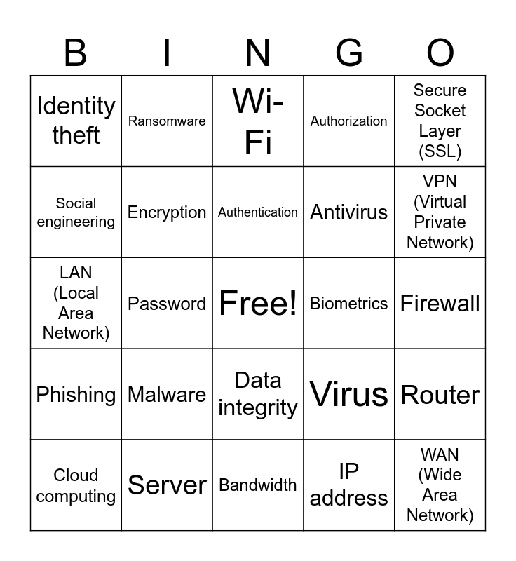 This bingo card has a free space and 24 words: Malware, Server, Authentication, Cloud computing, Secure Socket Layer (SSL), Identity theft, Social engineering, Ransomware, Biometrics, Data integrity, Antivirus, LAN (Local Area Network), Virus, Router, Encryption, IP address, Firewall, Wi-Fi, VPN (Virtual Private Network), Password, WAN (Wide Area Network), Phishing, Authorization and Bandwidth.