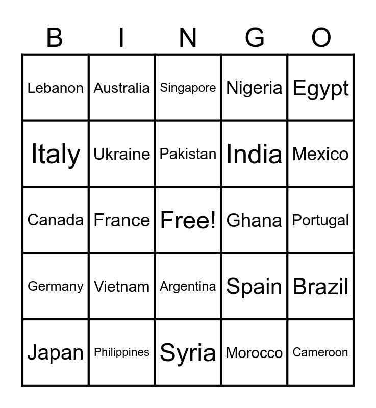 This bingo card has a free space and 29 words: Japan, Bolivia, France, Ethiopia, Lebanon, Singapore, Ukraine, Vietnam, Ghana, Philippines, Portugal, Cameroon, Syria, Morocco, Mexico, Libya, Argentina, Germany, Egypt, Canada, Spain, Eritrea, India, Italy, Nigeria, Australia, Brazil, Pakistan and Jamaica.