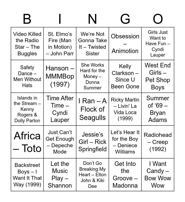 This bingo card has 105 words: Wake Me Up Before You Go-Go – Wham!, Material Girl – Madonna, Girls Just Want to Have Fun – Cyndi Lauper, Like a Virgin – Madonna, I Wanna Dance with Somebody – Whitney Houston, Karma Chameleon – Culture Club, 99 Red Balloons – Nena, Mickey – Toni Basil, Heaven Is a Place on Earth – Belinda Carlisle, I Think We’re Alone Now – Tiffany, Livin’ on a Prayer – Bon Jovi, Don’t Stop Believin’ – Journey, Sweet Child O’ Mine – Guns N’ Roses, Pour Some Sugar on Me – Def Leppard, You Give Love a Bad Name – Bon Jovi, Eye of the Tiger – Survivor, We’re Not Gonna Take It – Twisted Sister, Rock You Like a Hurricane – Scorpions, Any Way You Want It – Journey, I Love Rock 'n' Roll – Joan Jett & the Blackhearts, Take On Me – a-ha, Sweet Dreams (Are Made of This) – Eurythmics, Tainted Love – Soft Cell, Don’t You Want Me – The Human League, Everybody Wants to Rule the World – Tears for Fears, Just Can’t Get Enough – Depeche Mode, West End Girls – Pet Shop Boys, Obsession – Animotion, Voices Carry – ‘Til Tuesday, Love Plus One – Haircut 100, Let’s Hear It for the Boy – Deniece Williams, Get Into the Groove – Madonna, Holiday – Madonna, Rhythm of the Night – DeBarge, I Can’t Wait – Nu Shooz, Dancing with Myself – Billy Idol, Maniac – Michael Sembello, Footloose – Kenny Loggins, She Works Hard for the Money – Donna Summer, Let the Music Play – Shannon, Never Gonna Give You Up – Rick Astley, Africa – Toto, Come On Eileen – Dexys Midnight Runners, Safety Dance – Men Without Hats, Electric Avenue – Eddy Grant, Video Killed the Radio Star – The Buggles, Walk Like an Egyptian – The Bangles, I Ran – A Flock of Seagulls, Turning Japanese – The Vapors, I Want Candy – Bow Wow Wow, Billie Jean – Michael Jackson, Beat It – Michael Jackson, Purple Rain – Prince, When Doves Cry – Prince, Let’s Go Crazy – Prince, Faith – George Michael, Sledgehammer – Peter Gabriel, The Way You Make Me Feel – Michael Jackson, Little Red Corvette – Prince, Jessie’s Girl – Rick Springfield, Summer of ‘69 – Bryan Adams, Centerfold – The J. Geils Band, You Make My Dreams – Hall & Oates, Walk of Life – Dire Straits, Rosanna – Toto, What I Like About You – The Romantics, Your Love – The Outfield, St. Elmo’s Fire (Man in Motion) – John Parr, Islands in the Stream – Kenny Rogers & Dolly Parton, Time After Time – Cyndi Lauper, Don’t Go Breaking My Heart – Elton John & Kiki Dee, Easy Lover – Philip Bailey & Phil Collins, Under Pressure – Queen & David Bowie, I Got You Babe – UB40 & Chrissie Hynde, Say Say Say – Paul McCartney & Michael Jackson, On the Radio – Donna Summer, Nothing's Gonna Change My Love for You – Glenn Medeiros, Tell It to My Heart – Taylor Dayne, Backstreet Boys – I Want It That Way (1999), Britney Spears – ...Baby One More Time (1998), NSYNC – Tearin' Up My Heart (1997), Spice Girls – Wannabe (1996), Aqua – Barbie Girl (1997), Hanson – MMMBop (1997), Christina Aguilera – Genie in a Bottle (1999), Ricky Martin – Livin' La Vida Loca (1999), Madonna – Vogue (1990), Celine Dion – My Heart Will Go On (1997), Oasis – Wonderwall (1995), Nirvana – Smells Like Teen Spirit (1991), Third Eye Blind – Semi-Charmed Life (1997), Alanis Morissette – You Oughta Know (1995), The Cranberries – Zombie (1994), Green Day – Good Riddance (Time of Your Life) (1997), Radiohead – Creep (1992), Eagle-Eye Cherry – Save Tonight (1997), Red Hot Chili Peppers – Under the Bridge (1992), Smash Mouth – All Star (1999), Kelly Clarkson – Since U Been Gone, Britney Spears – Toxic, Rihanna – Umbrella, Katy Perry – I Kissed a Girl, Avril Lavigne – Complicated, Lady Gaga – Just Dance and Beyoncé – Single Ladies (Put a Ring on It).