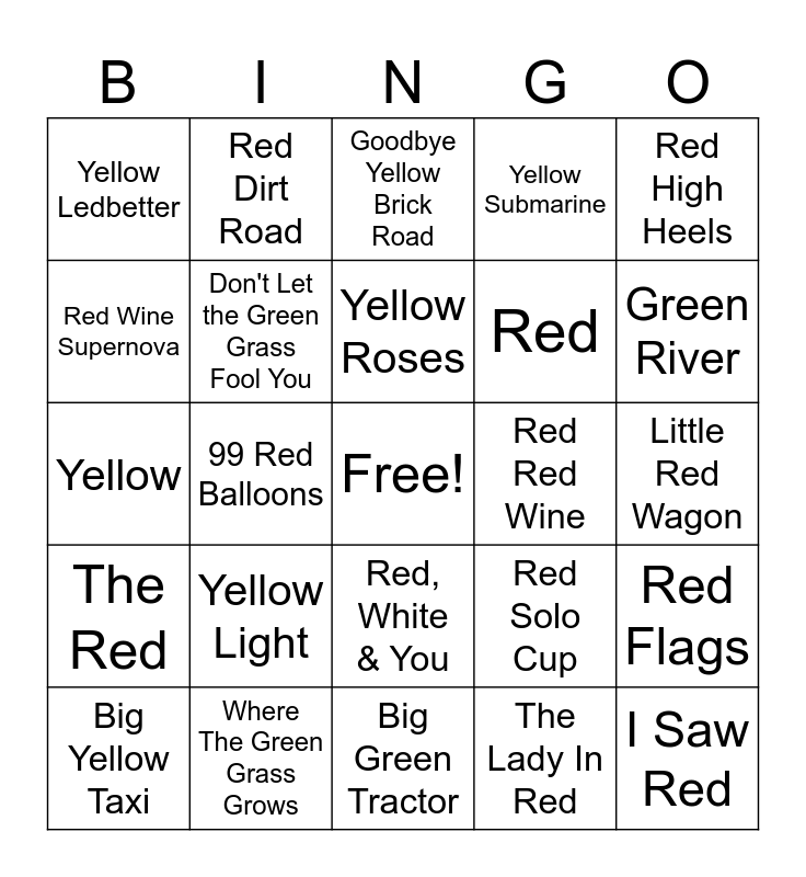 This bingo card has a free space and 27 words: Red Solo Cup, Black and Yellow, Red, Big Green Tractor, Red Wine Supernova, Goodbye Yellow Brick Road, Red Dirt Road, The Red, Red Red Wine, Red Flags, Yellow, Yellow Submarine, Big Yellow Taxi, Where The Green Grass Grows, Green River, John Deere Green, Don't Let the Green Grass Fool You, Yellow Roses, Yellow Light, Yellow Ledbetter, Little Red Wagon, The Lady In Red, 99 Red Balloons, I Saw Red, Red, White & You, Red High Heels and Like Red On a Rose.