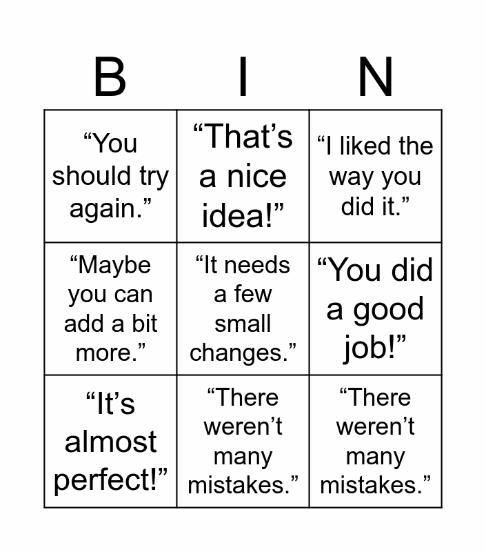 This bingo card has a free space and 8 words: “You did a good job!”, “I liked the way you did it.”, “That’s a nice idea!”, “It’s almost perfect!”, “You should try again.”, “There weren’t many mistakes.”, “Maybe you can add a bit more.” and “There weren’t many mistakes.”.