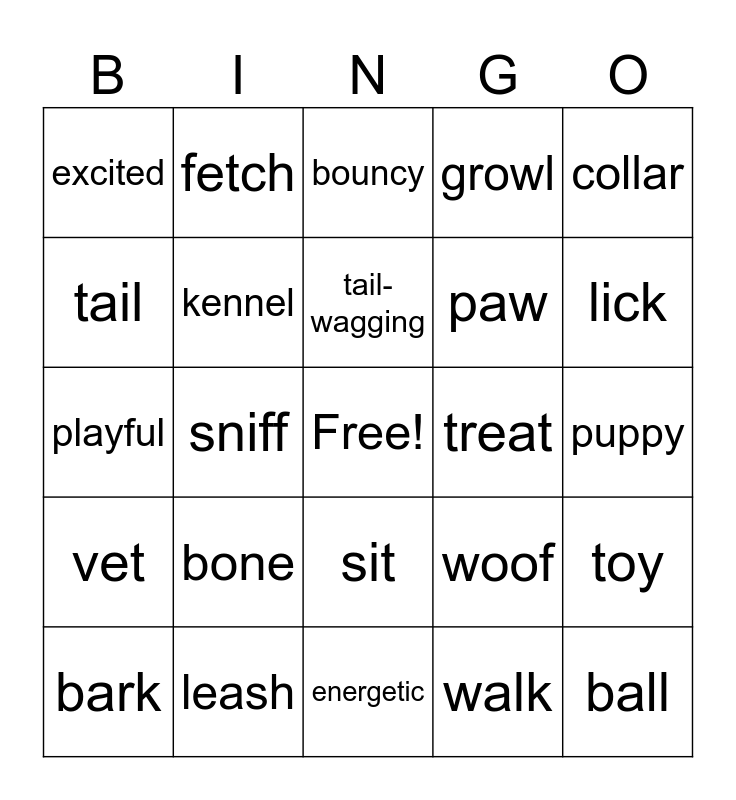 This bingo card has a free space and 24 words: bone, leash, tail-wagging, bark, collar, excited, tail, fetch, treat, sit, paw, playful, woof, toy, kennel, walk, puppy, bouncy, lick, sniff, ball, vet, growl and energetic.