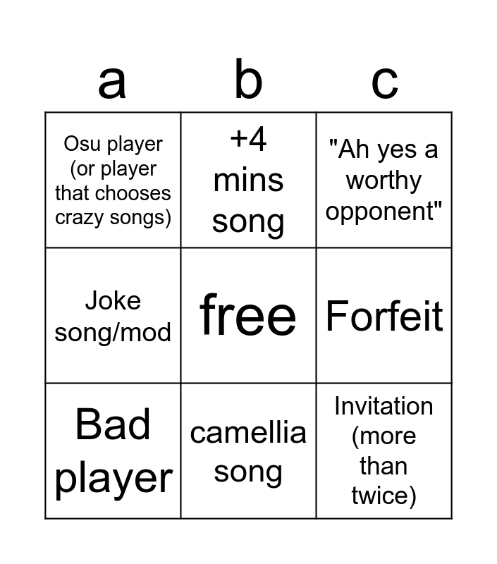 This bingo card has a free space and 8 words: Forfeit, "Ah yes a worthy opponent", +4 mins song, Bad player, Osu player (or player that chooses crazy songs), Invitation (more than twice), Joke song/mod and camellia song.