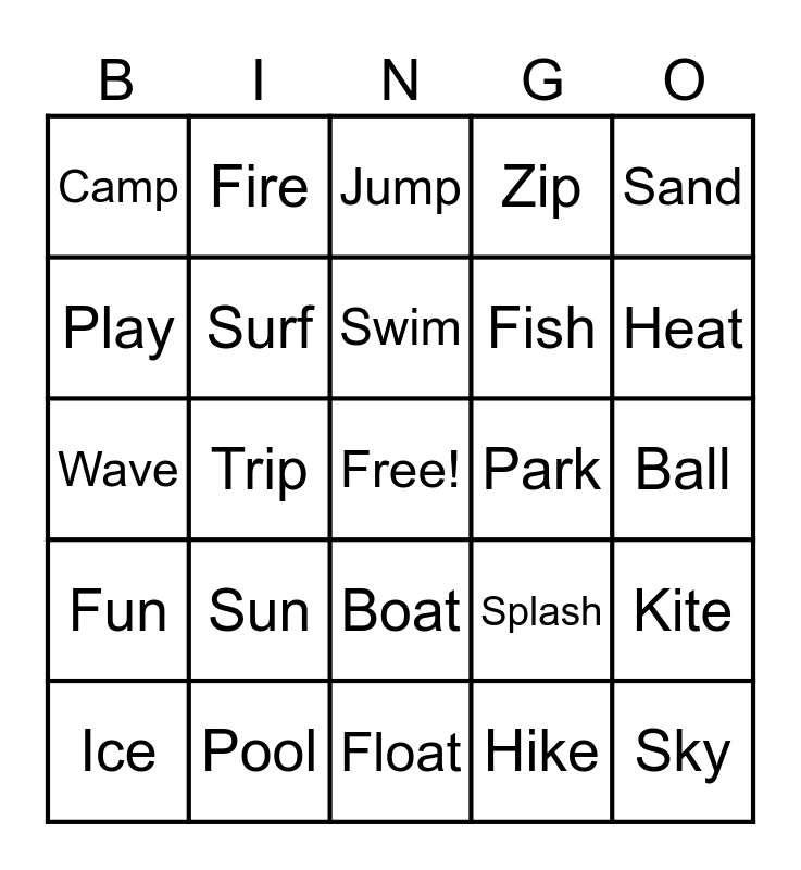 This bingo card has a free space and 24 words: Sun, Pool, Swim, Ice, Sand, Camp, Play, Fire, Park, Boat, Fish, Wave, Splash, Kite, Surf, Hike, Ball, Jump, Heat, Trip, Sky, Fun, Zip and Float.