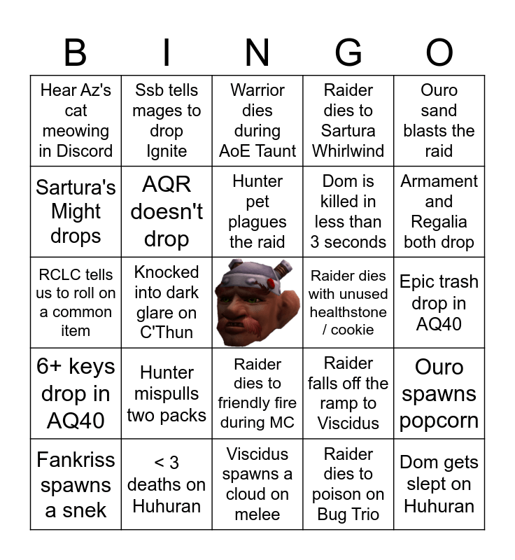 This bingo card has a free space and 39 words: Knocked into extra trash pack, Vek'lor kills a caster, Death's Sting drops, AQR doesn't drop, Fankriss spawns a snek, Raider dies to friendly fire during MC, Hunter pet plagues the raid, Scepter of the FP drops, Ouro sand blasts the raid, 6+ keys drop in AQ40, Knocked into dark glare on C'Thun, Raider dies to Sartura Whirlwind, Dom gets slept on Huhuran, Epic trash drop in AQ40, Raider dies with unused healthstone / cookie, Hunter mispulls two packs, Dark Storm Gauntlets drop, Hear Az's cat meowing in Discord, Red Bug mount drops, Raider falls off the ramp to Viscidus, Sartura's Might drops, Viscidus spawns a cloud on melee, Dom is killed in less than 3 seconds, Armament and Regalia both drop, Raider dies to eye beam on C'Thun, Mantle of Wicked Revenge drops, Viscidus is frozen ONLY twice, Raider dies to fall damage, Nobody dies on Skeram, Ssb tells mages to drop Ignite, Raider dies to meteor, TTF wipes once or more, Warrior dies during AoE Taunt, < 3 deaths on Huhuran, Raider dies to poison on Bug Trio, 2+ enchants drop in AQ40, Ouro spawns popcorn, RCLC tells us to roll on a common item and Skeram kills a raider with 2+ Earth Shocks.
